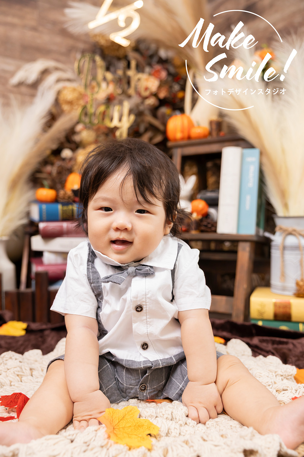 足元には紅葉がふんわりと舞い、周りにはころんとかわいいかぼちゃたち。