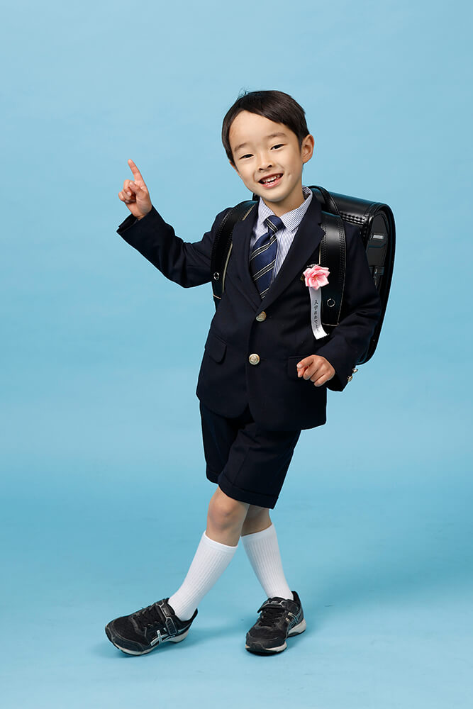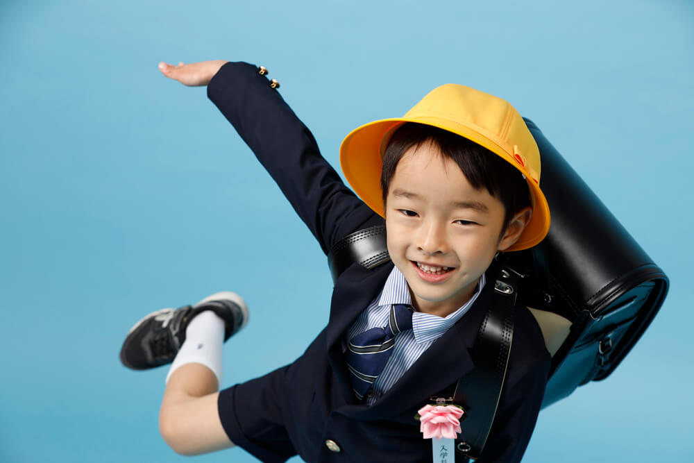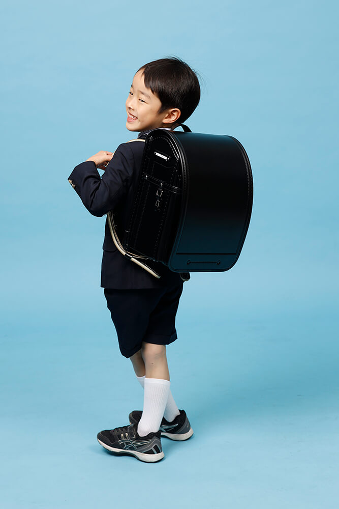 トラディショナルなブラックのランドセルが、青空ブルーの背景紙によく映えます。