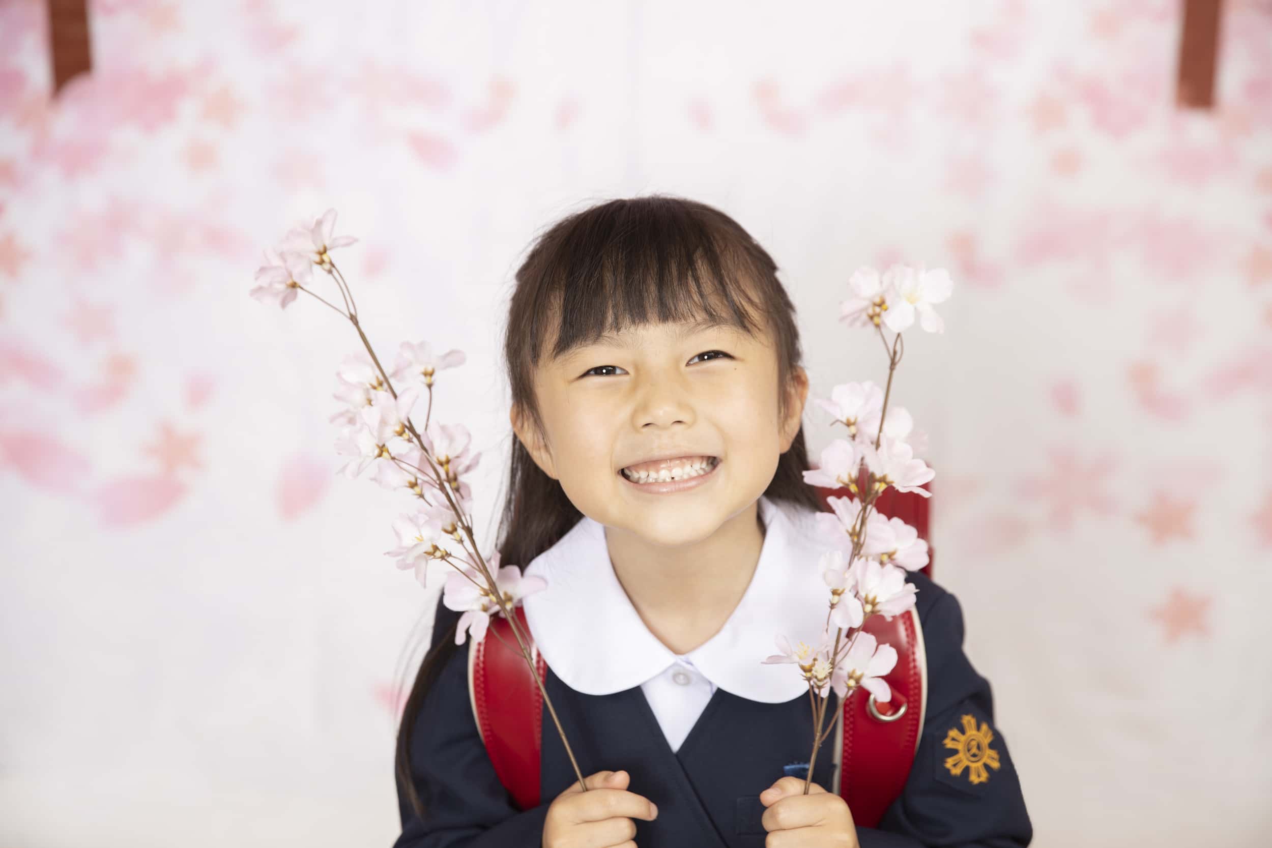 妹さんは桜と一緒にニコ〜 ピカピカのランドセルと撮影!