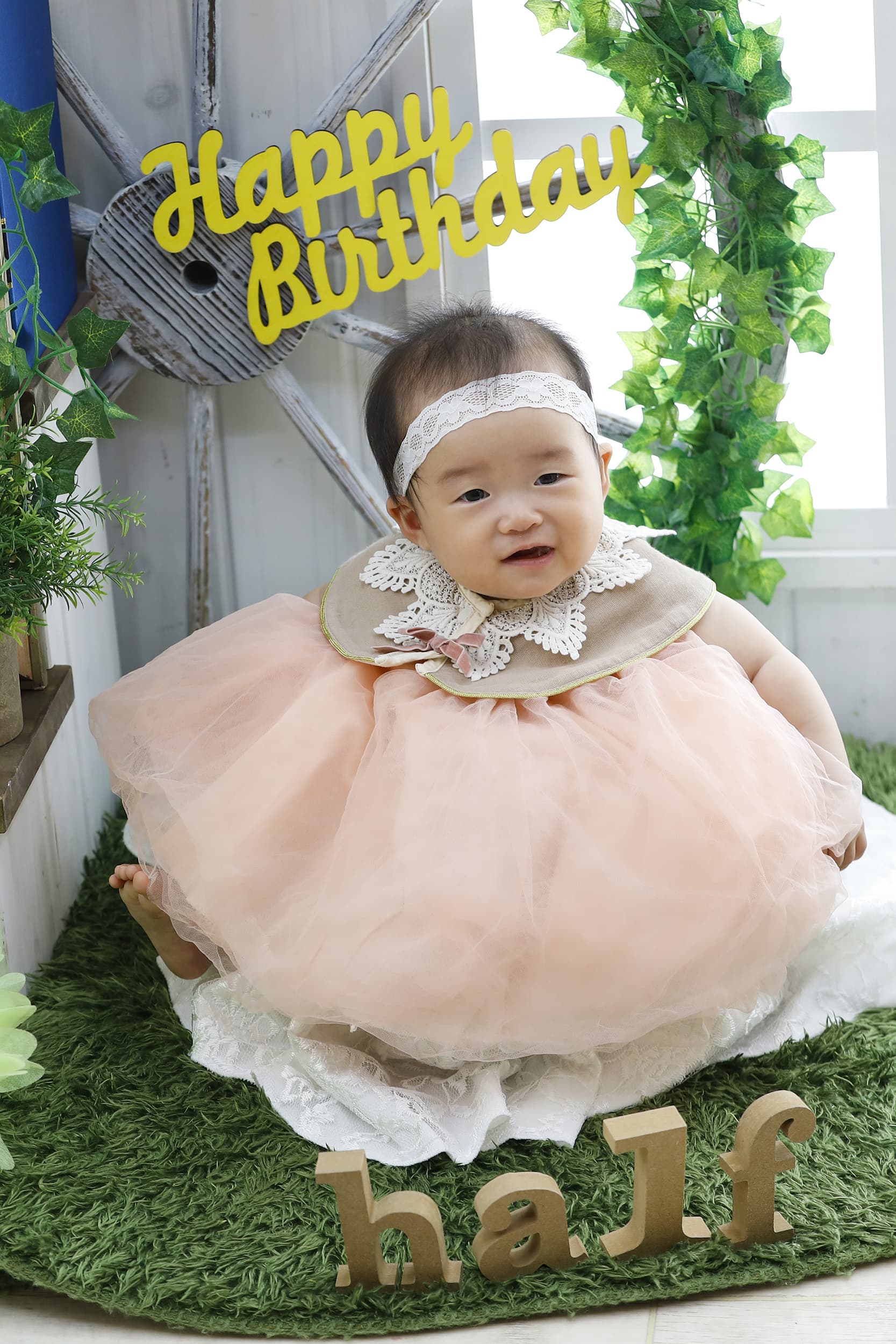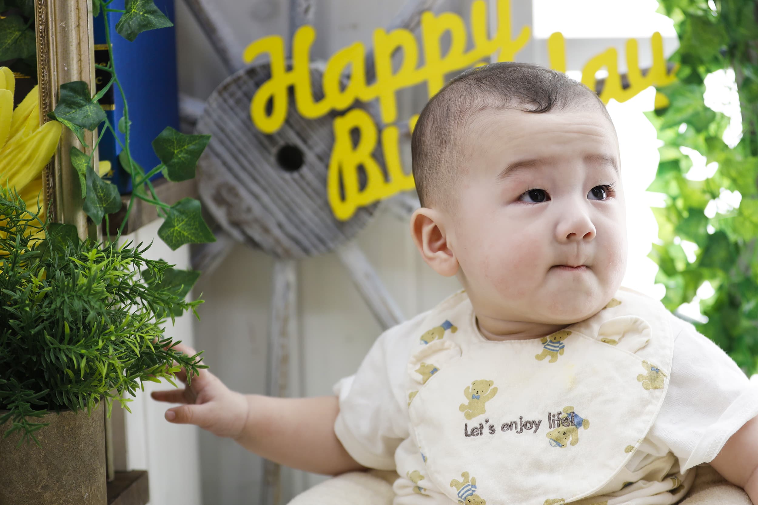 ママと離れてちょっぴり緊張気味なお顔も、ハーフバースデーならでは。