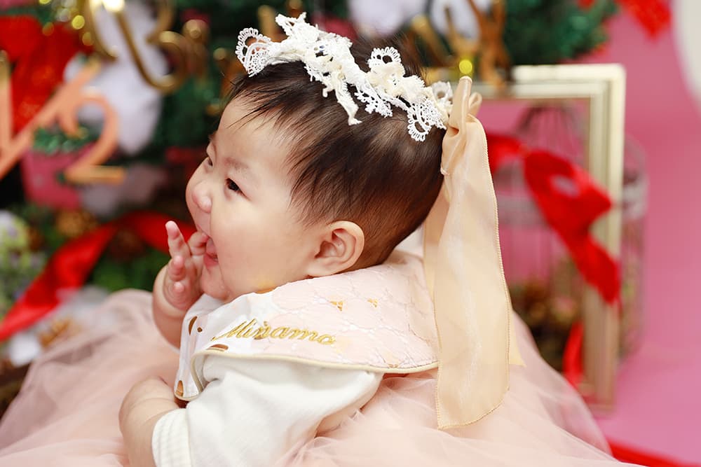 お宮参りには、ママさんのウェディングドレスをリメイクしたベビードレスというハッピー極まる装いでご来店くださいましたね。