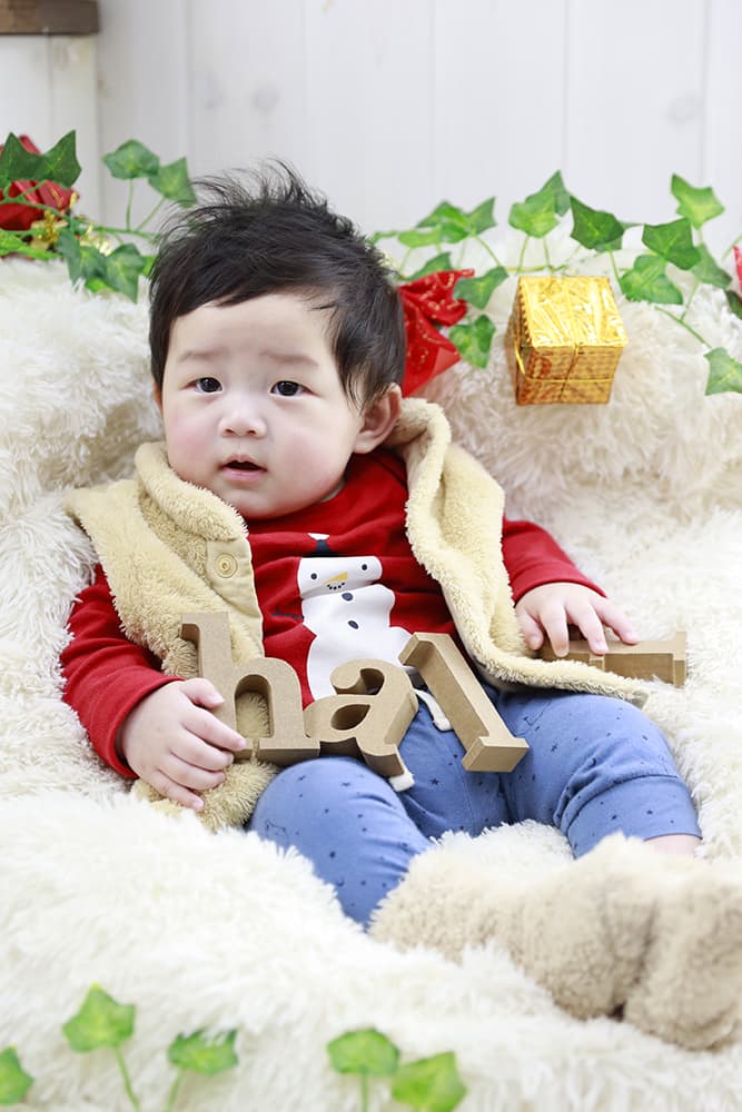 「1/2」のイラスト入りスタイをつけて、カメラ目線バッチリです!