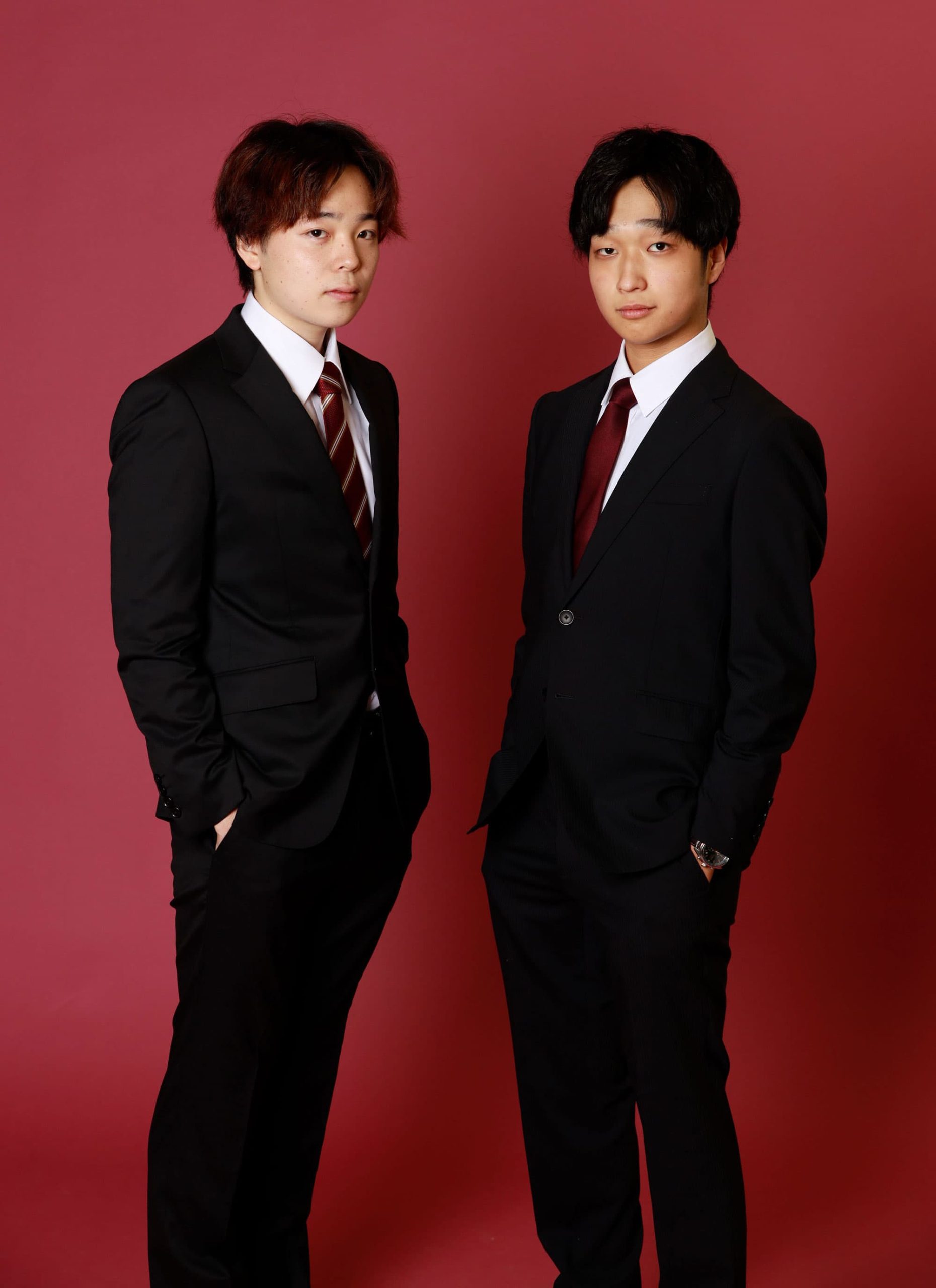 スーツを纏って、お友達とパシャリッ!ルビーの背景がよく似合いますね〜