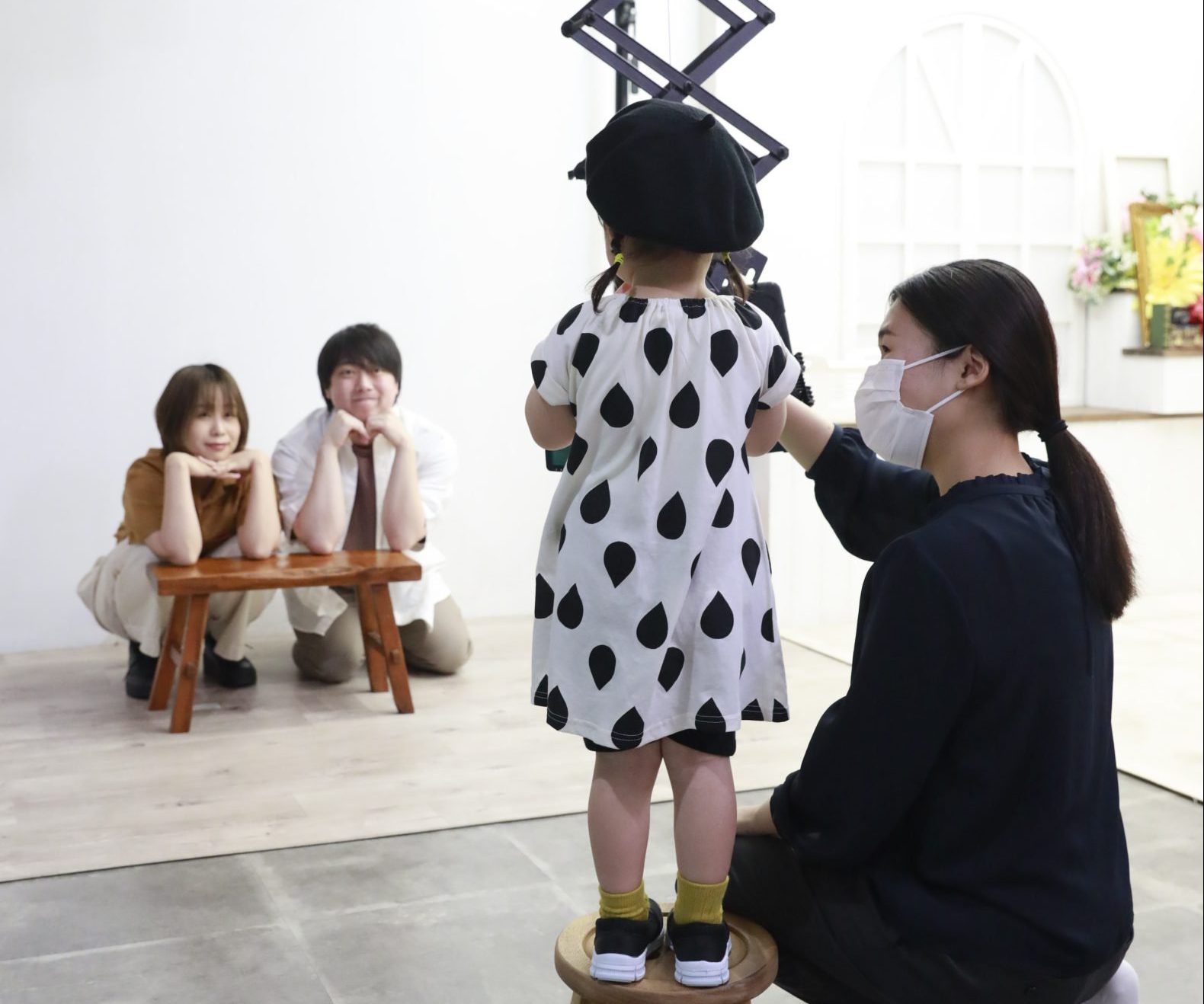 ママさんとパパさんにかわいいポーズを指示するカメラマンちゃん。