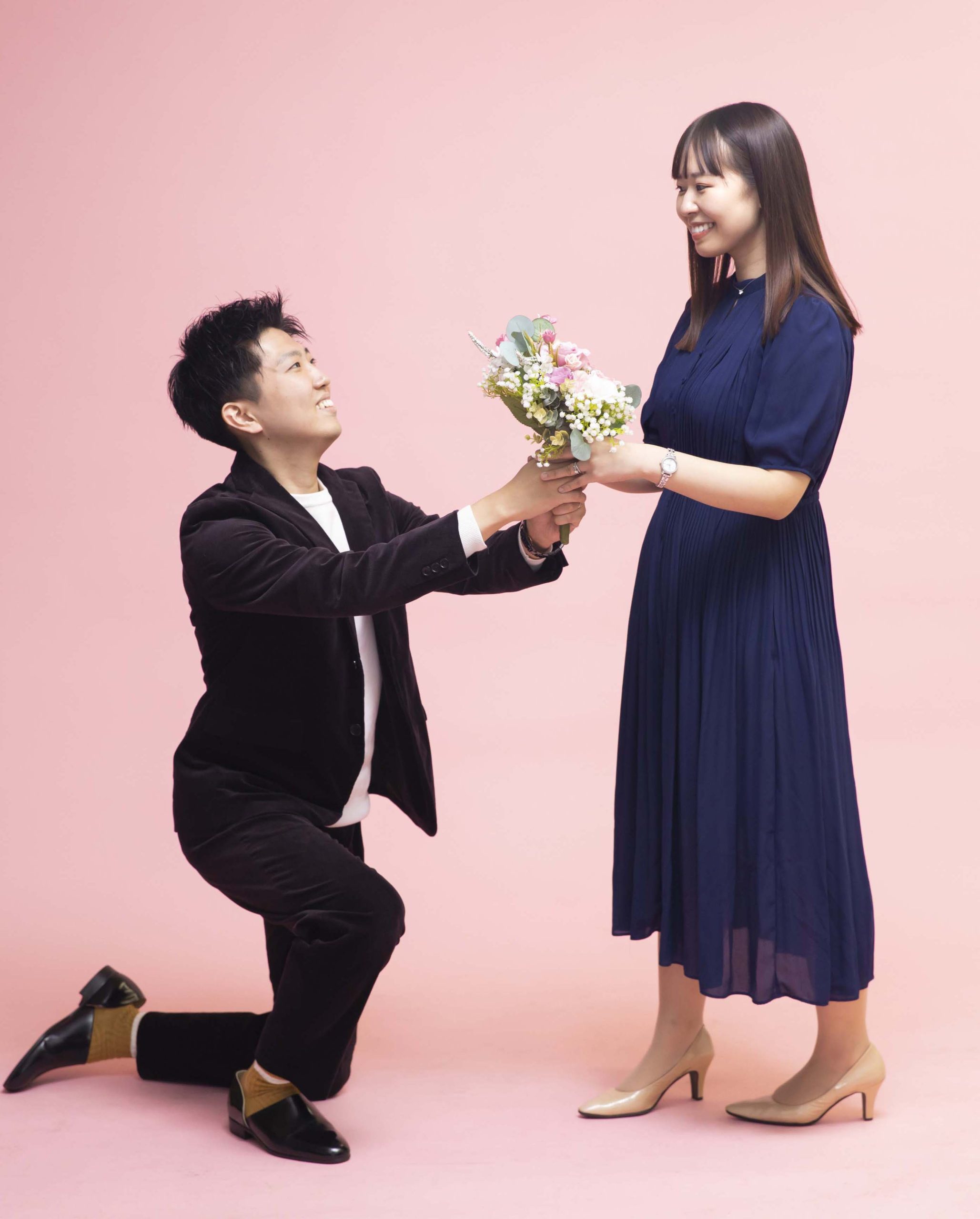 このプロポーズ風写真は私が好きなポーズなので、いろんな新婚さんにやってもらっています。笑
