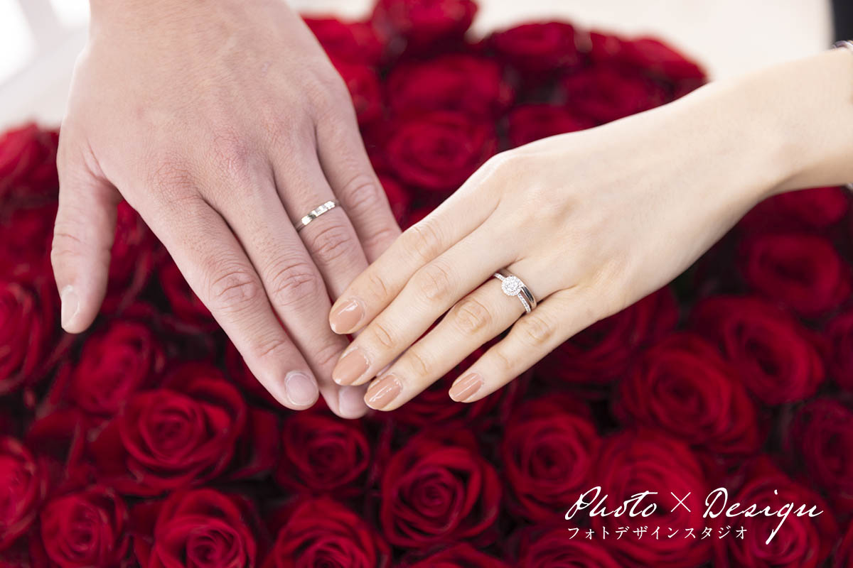 次のお写真は、お持ち込みいただいた大きな薔薇の花束の上でリングフォト。