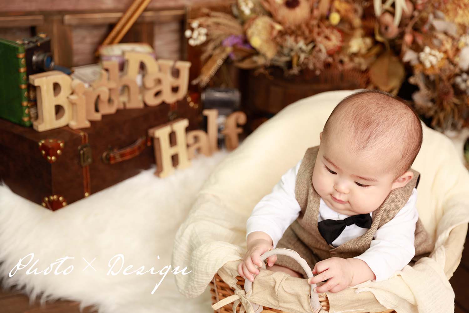 今回は、とってもおしゃれなコスチュームでご参加くださったハーフバースデーBOYのお写真をご紹介しますー。