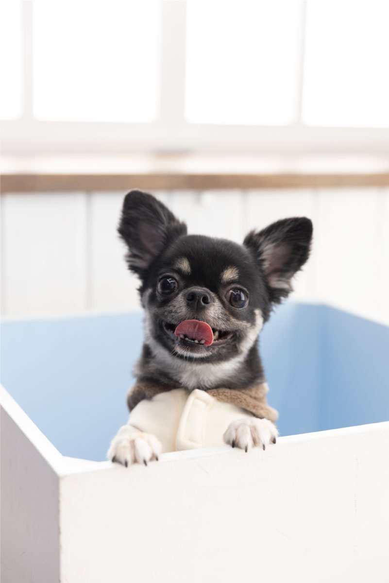 赤ちゃんがソロ撮影中、箱の中で待機しているチワワさん。